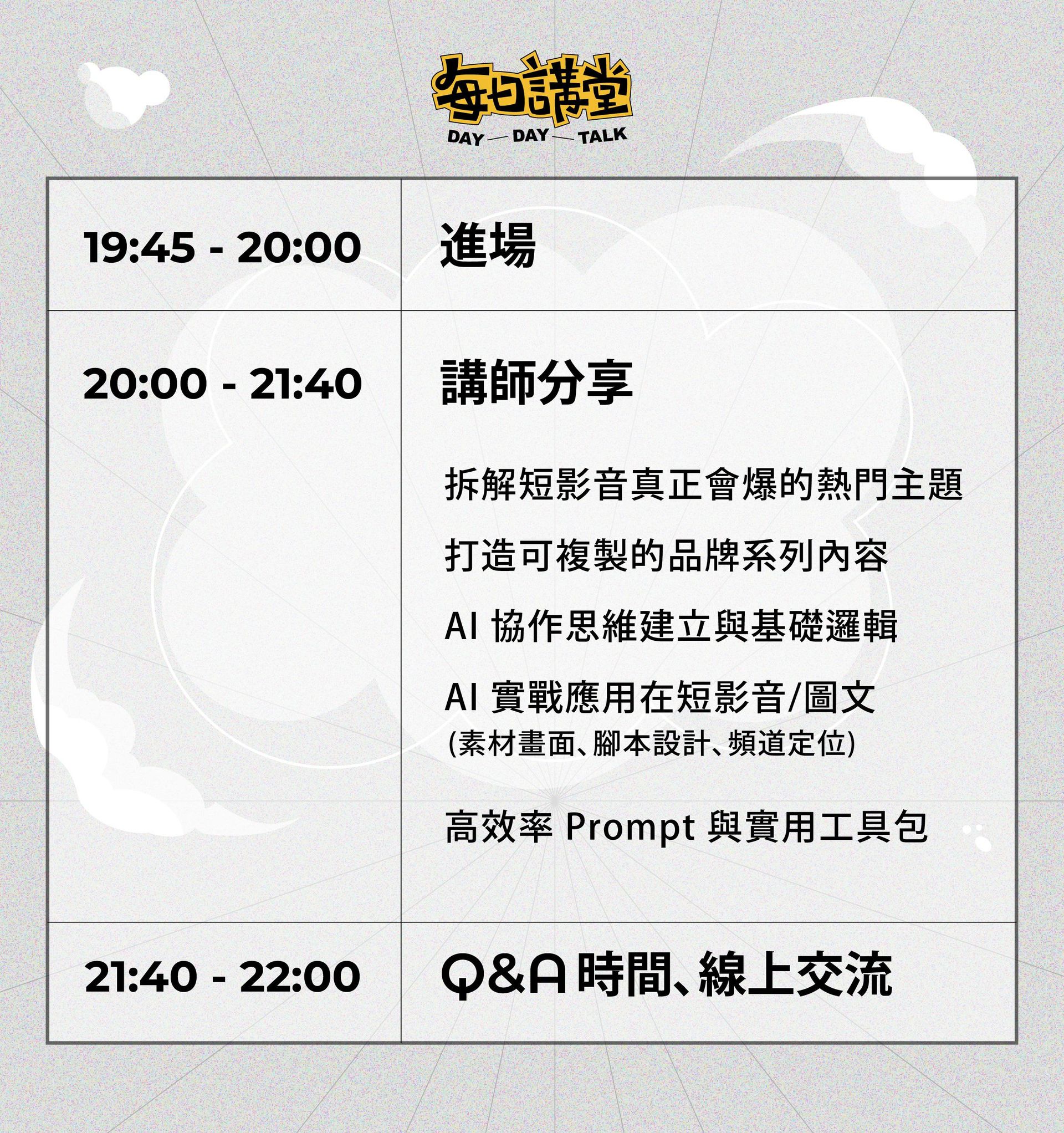 邀請百萬流量知名品牌(明月堂、時尚屋傢俱、黑蚊滾)幕後操盤手,透過熱門主題拆解、系列內容設計以及 AI 協作流程層邏輯與實戰玩法,讓你不再亂發、不再賭運氣,而是每一篇都有目的地累積影響力與變現可能。