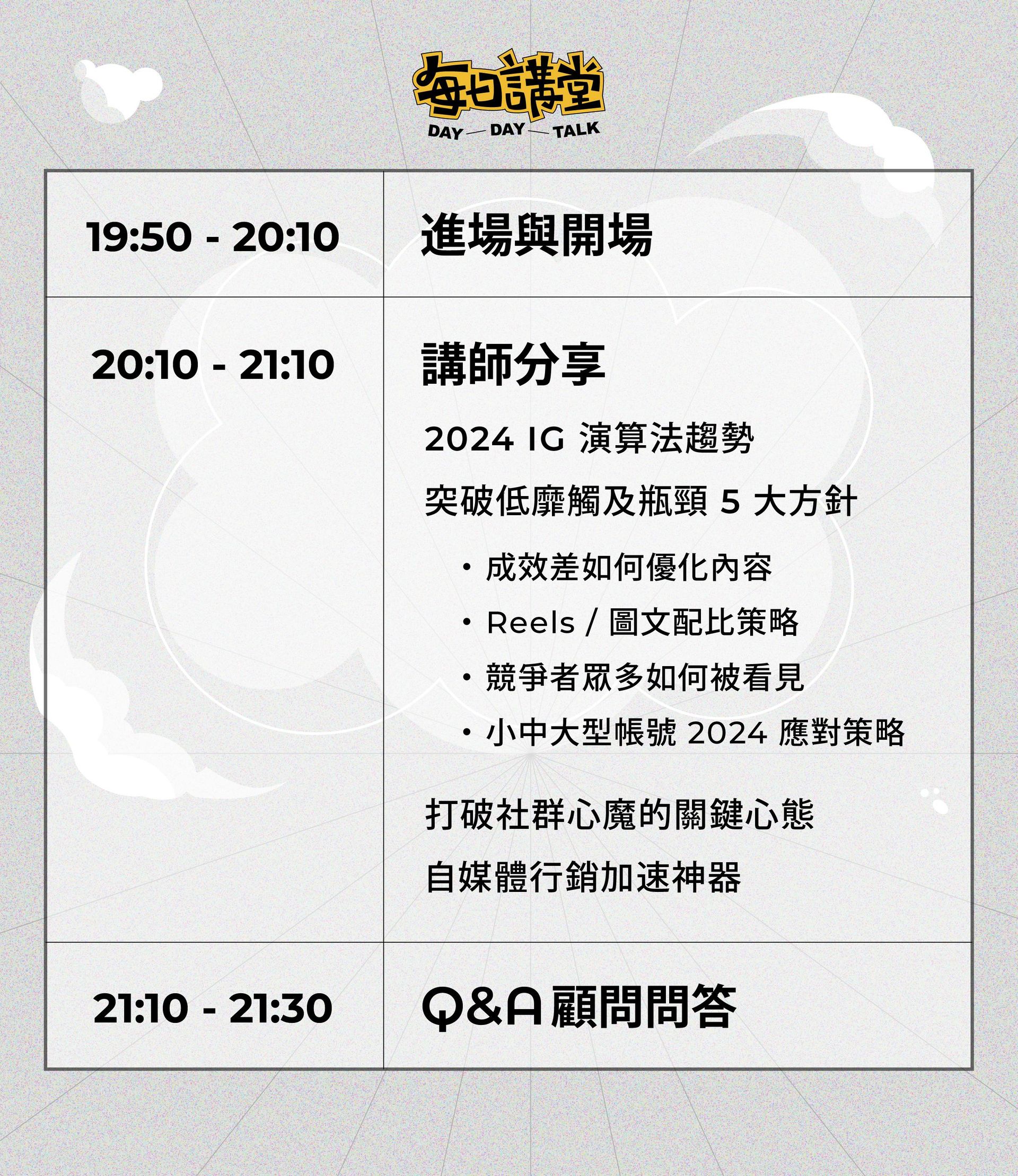 ⚠ 本場講座為免費直播講座,輸入優惠代碼「2024IG」即可全額折抵。如遺忘折抵,根據〈 通訊交易解除權合理例外情事適用準則 〉凡報名購買後不適用鑑賞期,恕不接受退課、退費、換課之申請,敬請見諒。
