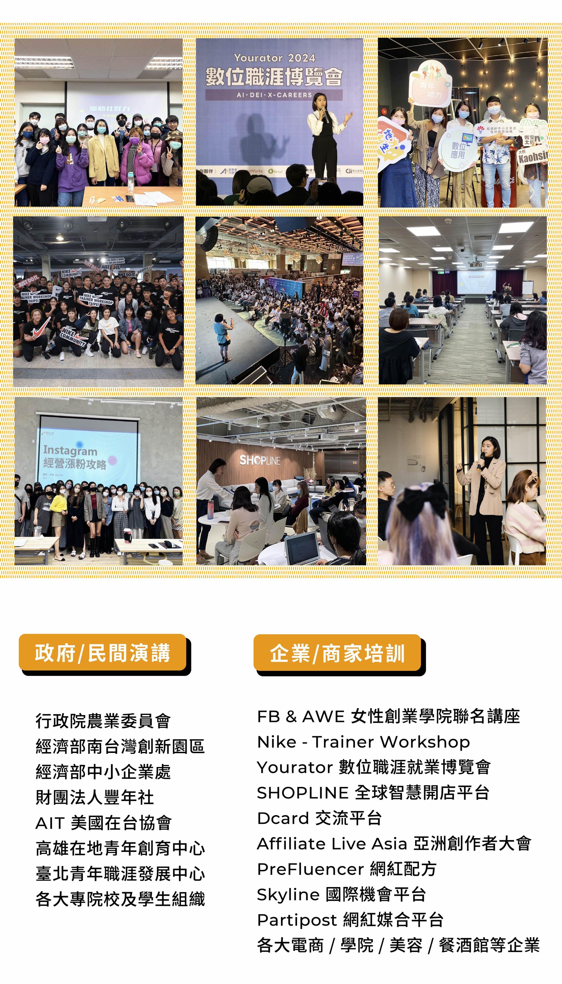 曾受邀演講於各大專院校、政府(經濟部、行政院)、民間單位(AIT 美國在台協會、臺北青年職涯發展中心)、企業教育訓練(三井不動產集團、Nike、SHOPLINE、BMW、Yourator、信義房屋)數十個單位。