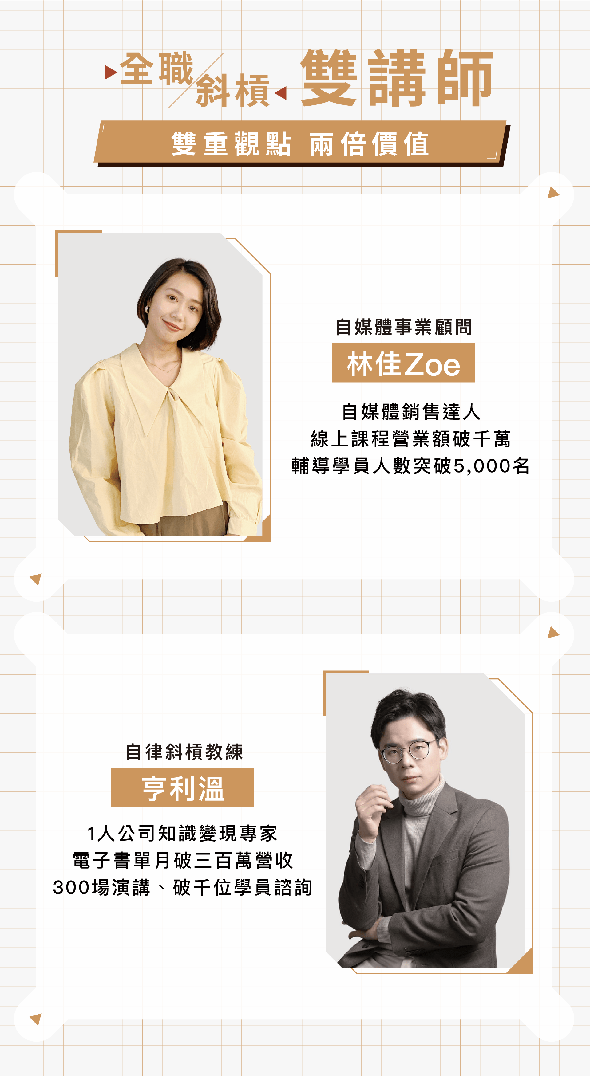 畢業於台科大MBA,目前擔任外商軟體業的品牌運營經理,在 IG 分享超過 500 篇知識貼文,幫助學員實踐自我成長,養成好習慣,打造斜槓職涯,累積 8.9 萬粉絲追蹤;並兼任台大、政大、清大等 20+ 大學、教育部青年局、Google、商周等企業合作講師,負責內容行銷、自媒體經營、個人成長、斜槓職能等相關課程。