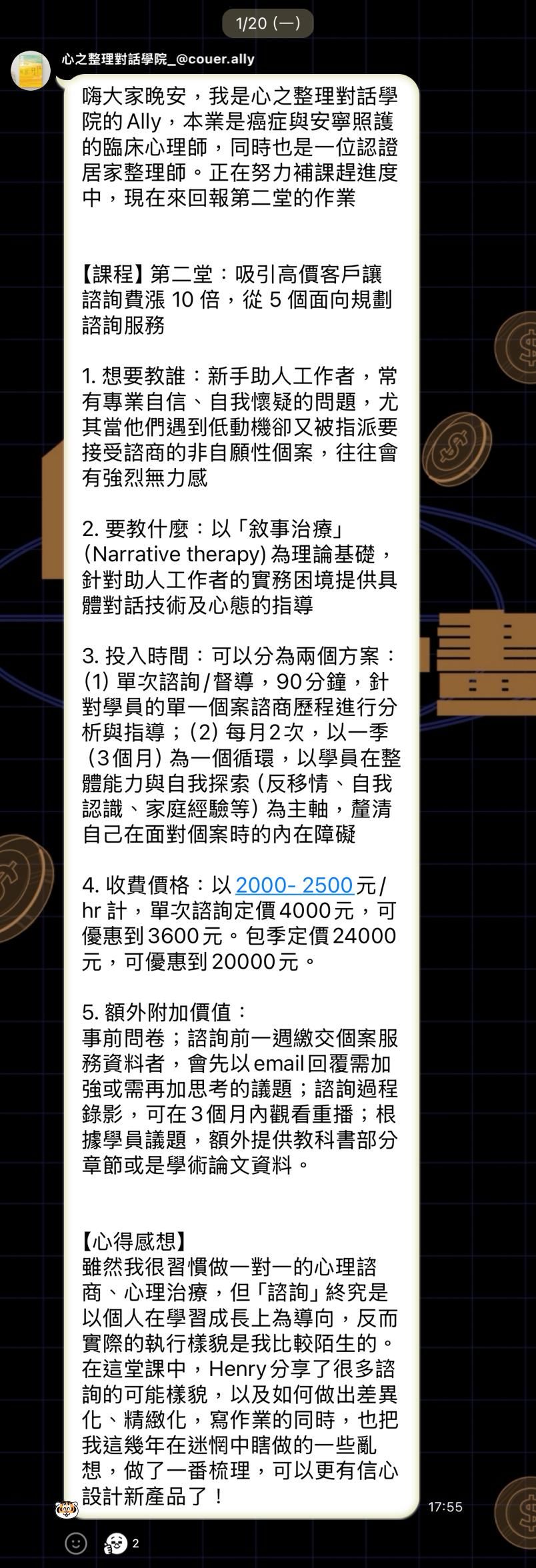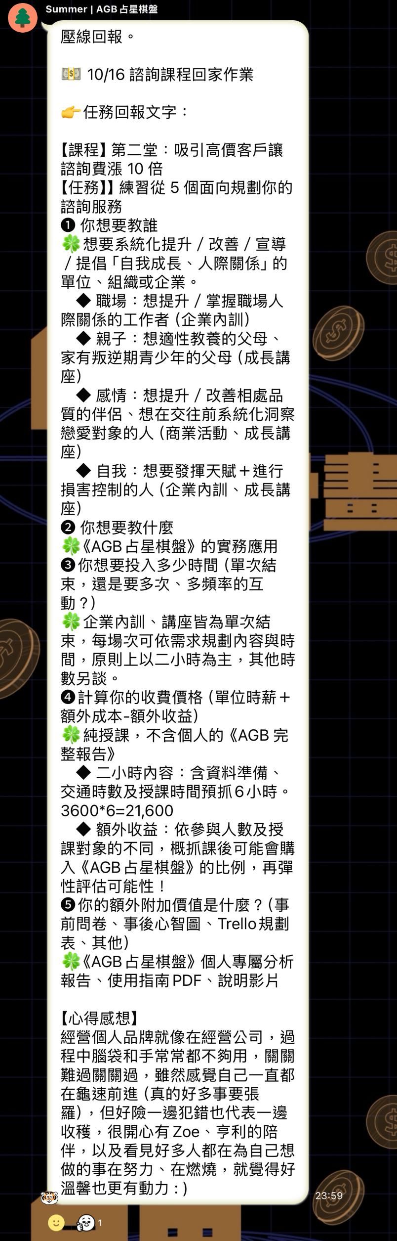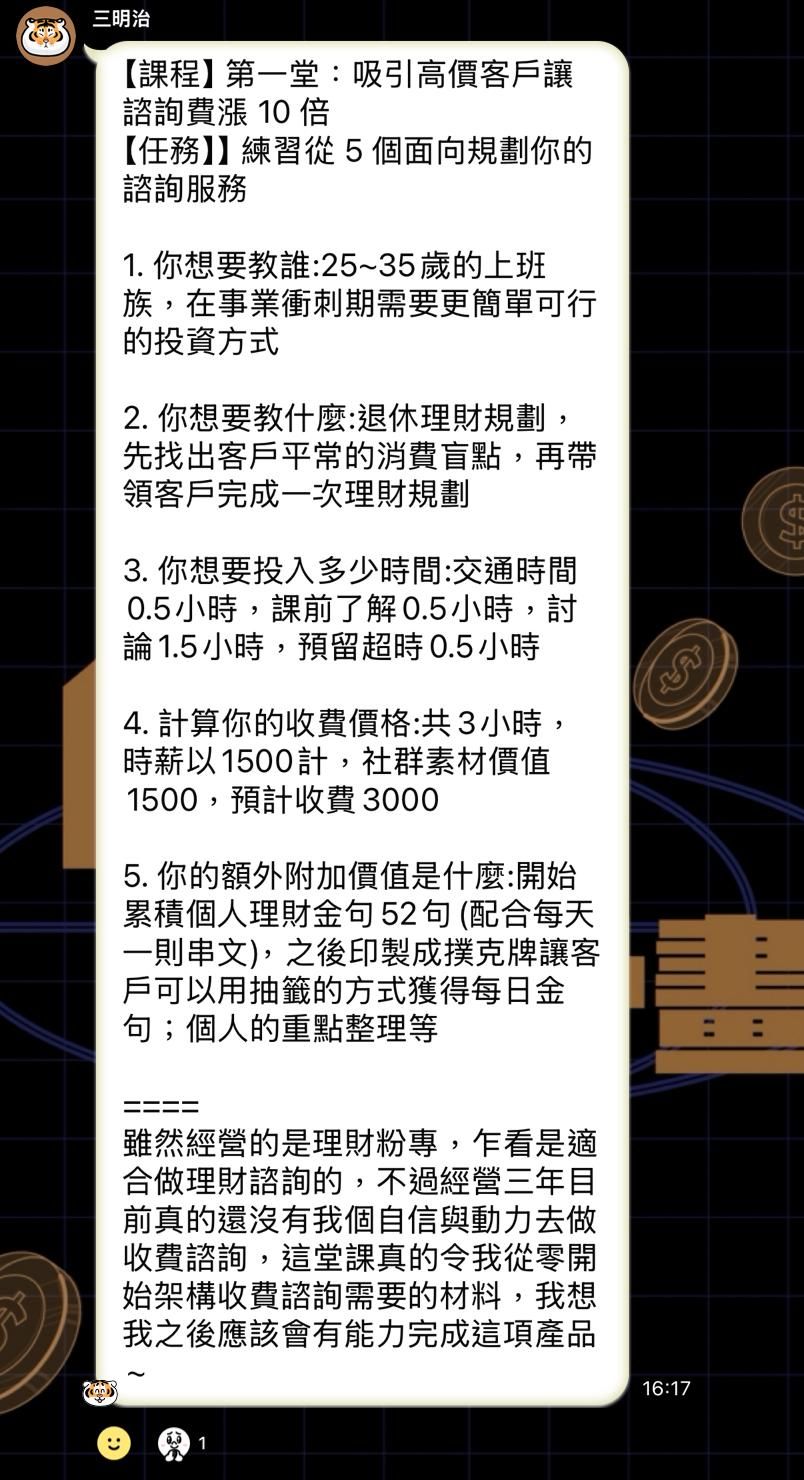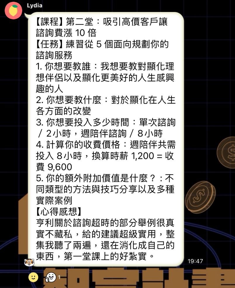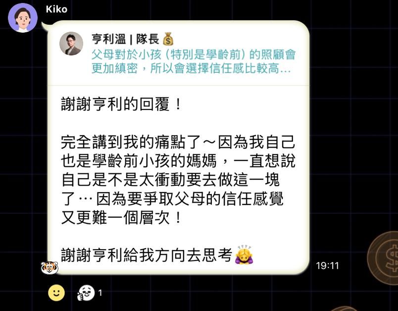 這可不是一般的群組問答而已 —— 我們平時一對一諮詢費用是3000元起/每小時,但在這裡,你只要加入計畫,就能每週面對面提問、依照問題難易每次約 5 ~ 20 分鐘的深度回應,半年下來,等於你擁有長達數小時的專屬商業顧問服務!