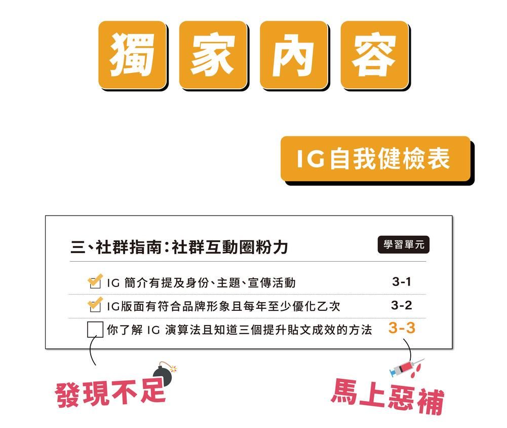 完整單元會公開詳細操作步驟,教會你讓互動率翻倍成長的獨門祕技,建立 IG 貼文及限時動態良好循環!
