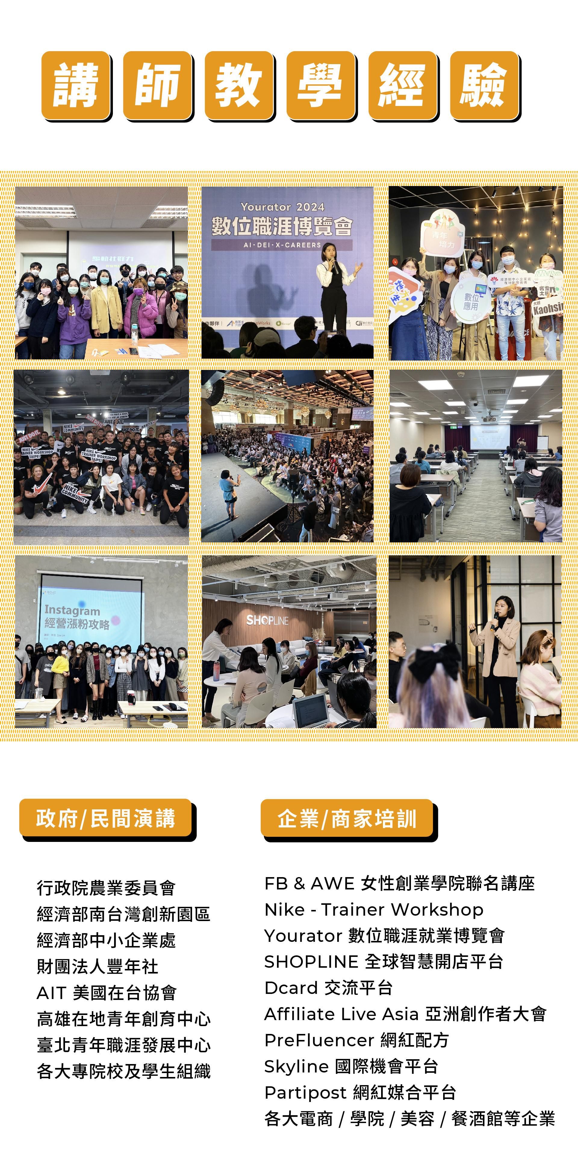 曾受邀演講於各大專院校、政府(經濟部、行政院)、民間單位(AIT 美國在台協會、臺北青年職涯發展中心)、企業教育訓練(三井不動產集團、Nike、SHOPLINE、BMW、Yourator、信義房屋)數十個單位。