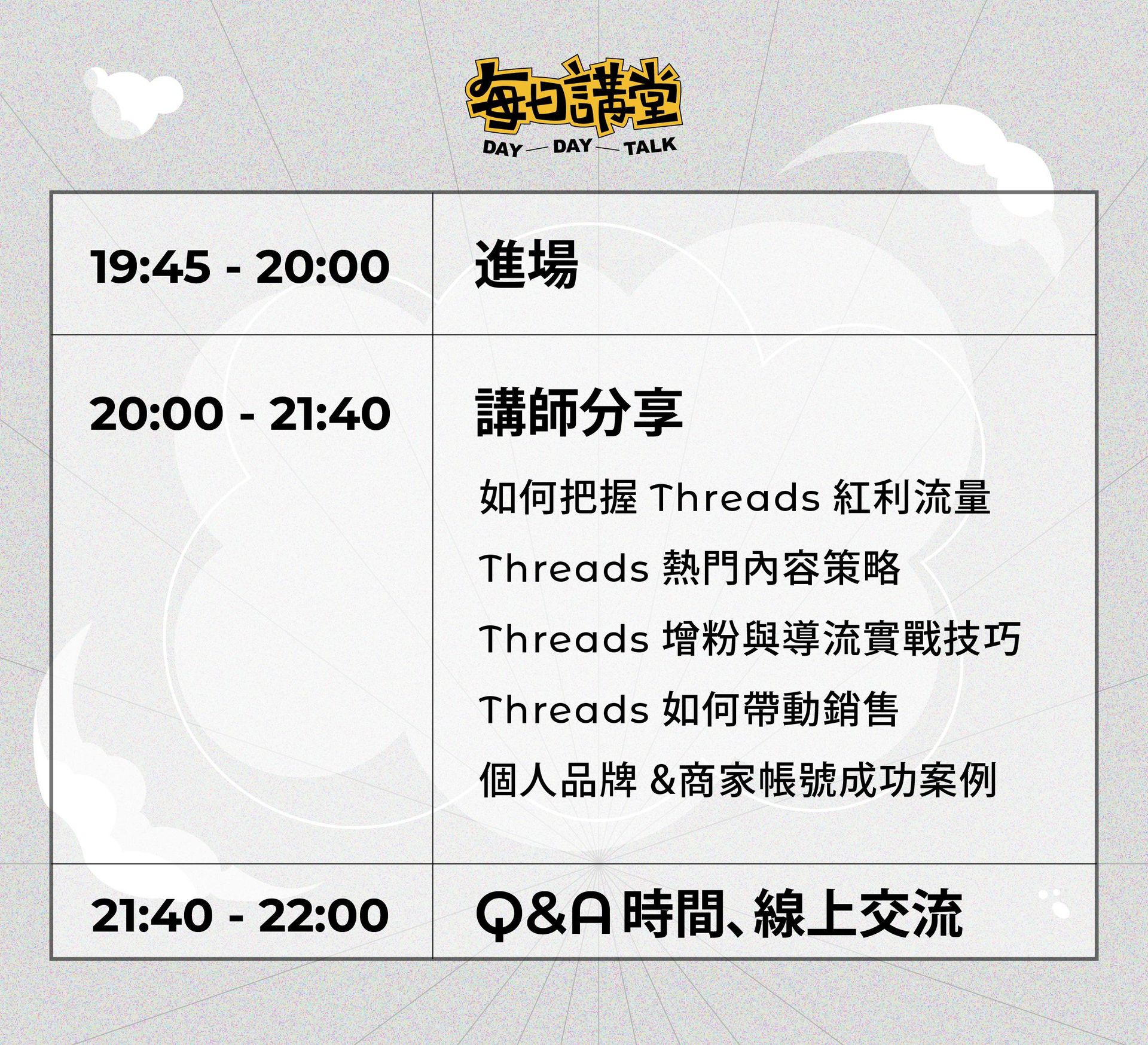 每日講堂 DayDayTalk 為〈 每日一錠數位內容工作室 DayDayDing 〉舉辦的系列講座,將邀請各領域專家達人揭秘趨勢新知與親身經歷,打造有趣的交流互動空間,歡迎加入每一場知識派對!